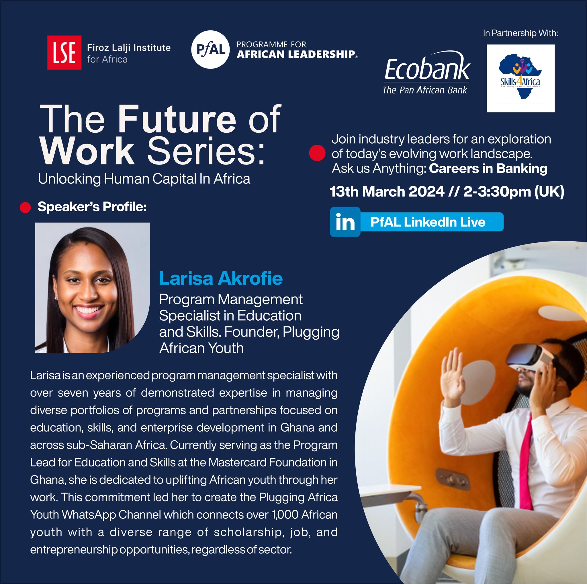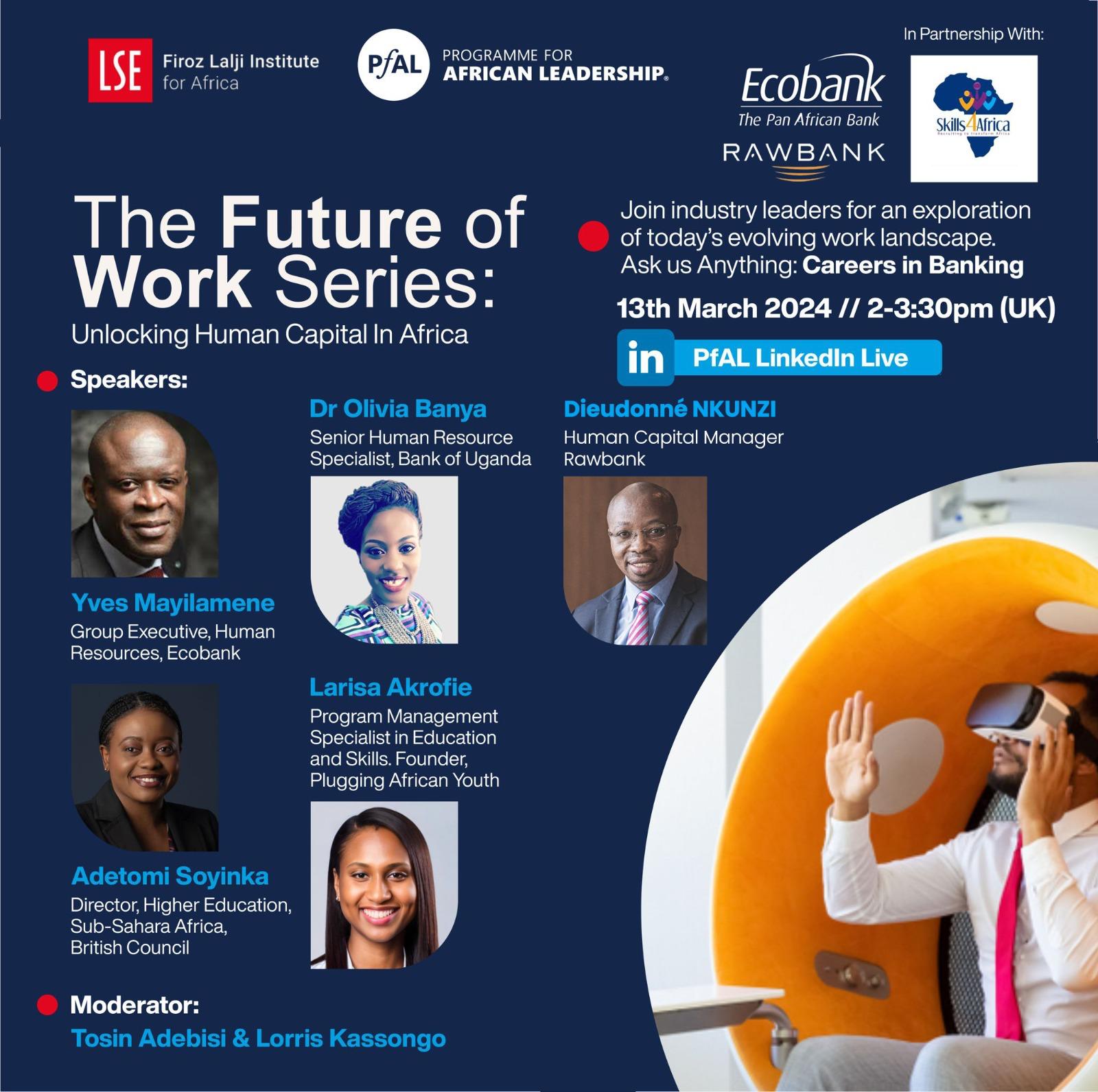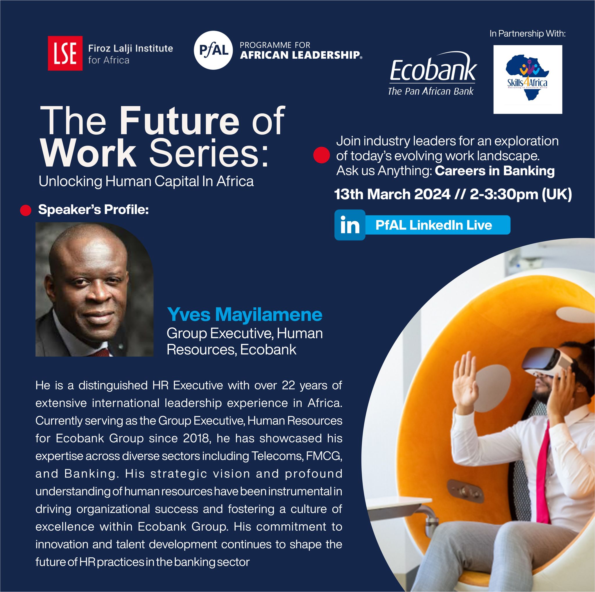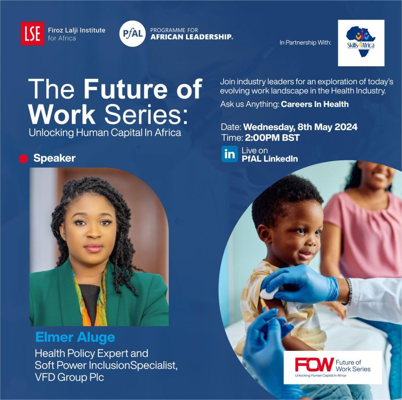 The webinar series launched by LSE Pfal (Program for African Leaders ) in partnership with L’Elite Agency Ltd aims to explore and discuss the evolving landscape of work in the African continent. With the theme centered around the Future work landscape in Africa; this will provide attendees with more than just repeat opportunities for engagement before to truly dive into skills4afrika recruitment forum scheduled for the 15th to 16th of November 2024 – The series will cover multiple topics that may be of interest topic and provide actionable takeaways. The webinar series seeks to foster dialogue, share insights, and explore innovative solutions. It will feature a virtual participation to ensure inclusivity and accessibility. Renowned academics, industry leaders, LSE students and other universities students, Alumni from the last two years or so, policymakers, and successful entrepreneurs will be invited as speakers to provide their expertise and perspectives on the subject matter.Throughout the webinar, various sub-themes related to the future of work in Africa will be explored. These include technological advancements, skills development, entrepreneurship, policy integration and sustainable work practices. The aim is to address the challenges and opportunities that arise from these developments and to identify strategies for a prosperous future of work in Africa.
