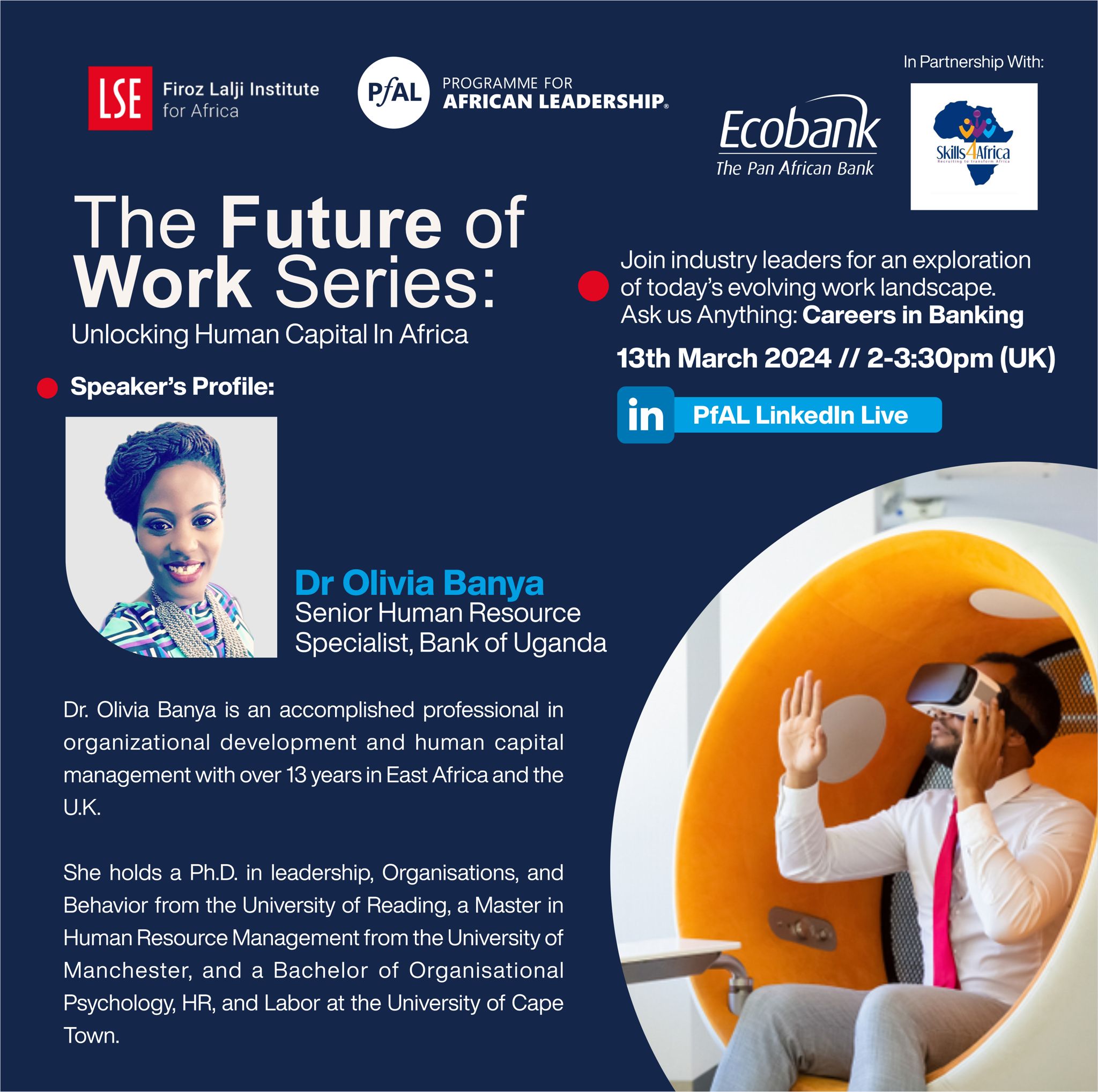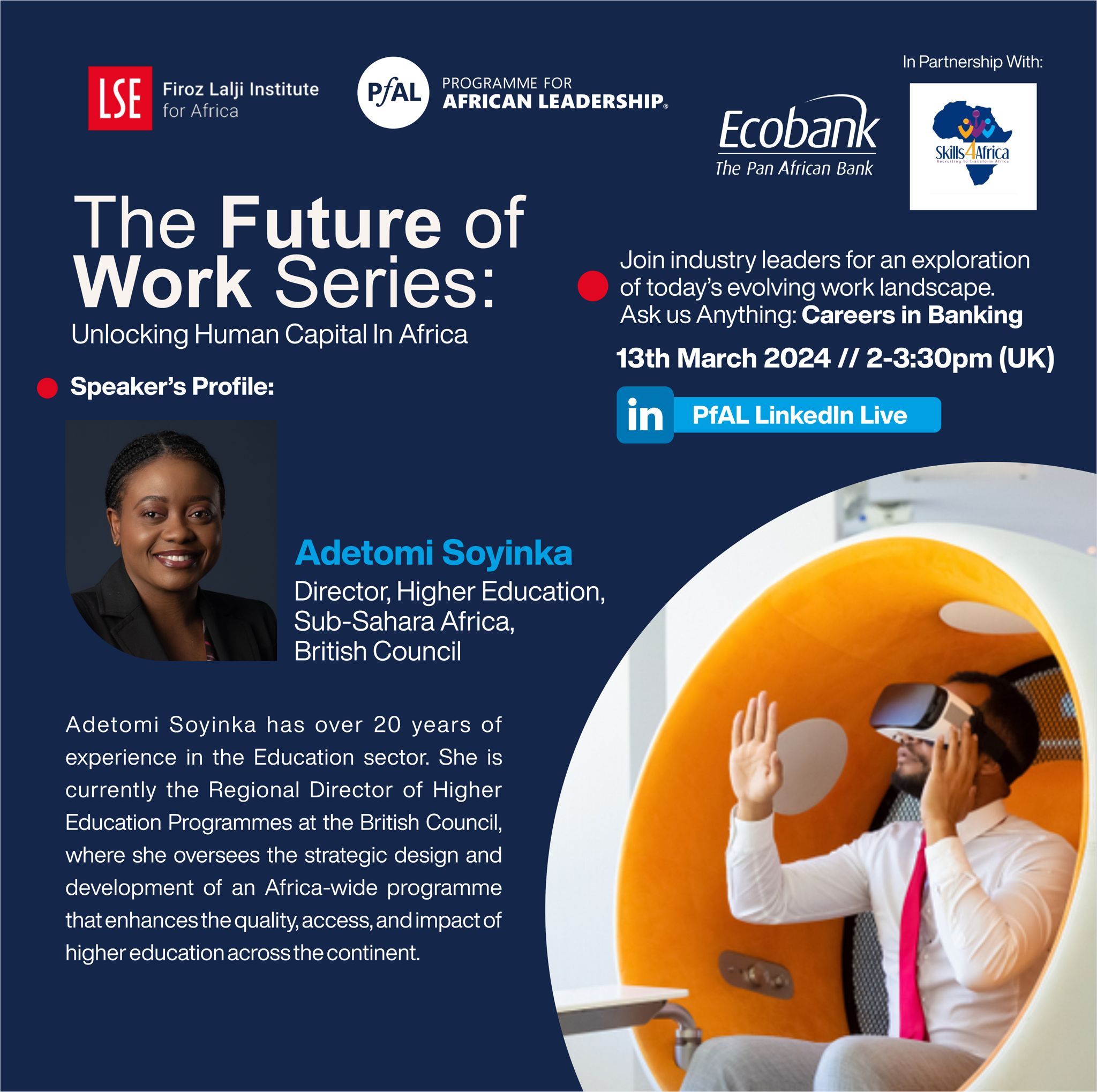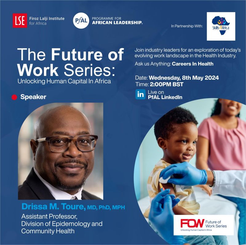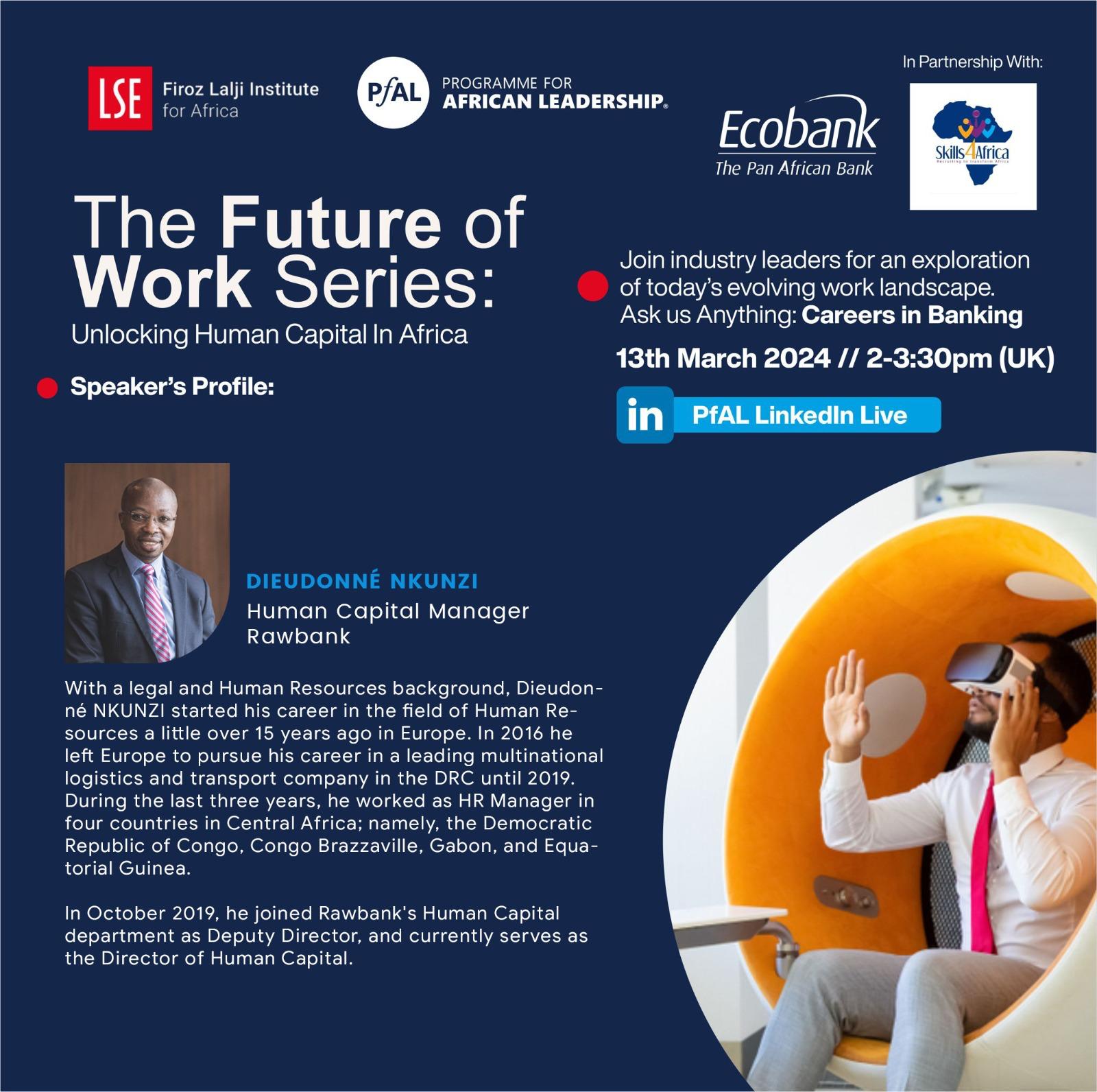 The webinar series launched by LSE Pfal (Program for African Leaders ) in partnership with L’Elite Agency Ltd aims to explore and discuss the evolving landscape of work in the African continent. With the theme centered around the Future work landscape in Africa; this will provide attendees with more than just repeat opportunities for engagement before to truly dive into skills4afrika recruitment forum scheduled for the 15th to 16th of November 2024 – The series will cover multiple topics that may be of interest topic and provide actionable takeaways. The webinar series seeks to foster dialogue, share insights, and explore innovative solutions. It will feature a virtual participation to ensure inclusivity and accessibility. Renowned academics, industry leaders, LSE students and other universities students, Alumni from the last two years or so, policymakers, and successful entrepreneurs will be invited as speakers to provide their expertise and perspectives on the subject matter.Throughout the webinar, various sub-themes related to the future of work in Africa will be explored. These include technological advancements, skills development, entrepreneurship, policy integration and sustainable work practices. The aim is to address the challenges and opportunities that arise from these developments and to identify strategies for a prosperous future of work in Africa.
